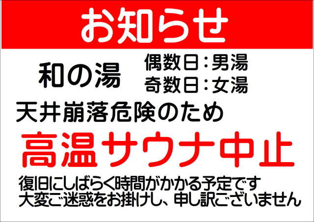 天井崩落危険があるため、当面の間「和の湯 高温サウナ」を中止とさせていただきます。