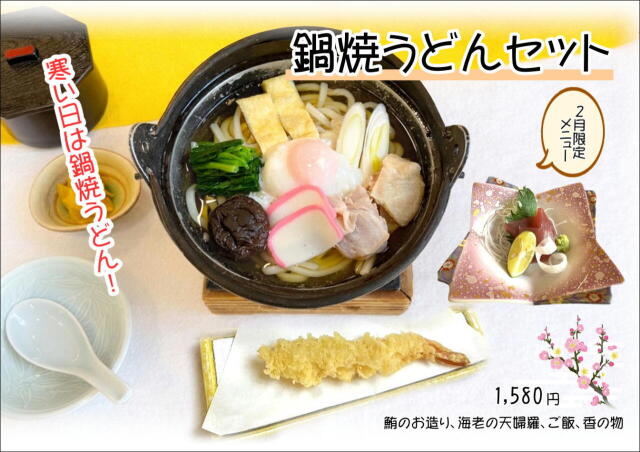 HOME お知らせ一覧 〜2月 レストラン秋月より〜 〜2月 レストラン秋月より〜 2026/01/30 〇2月限定メニュー 『鍋焼うどんセット 1,580円』○期間限定メニュー 『カキフライ定食 1,300円』 2月で終了予定 BACK HOME